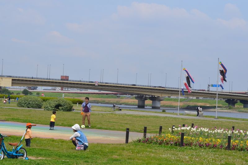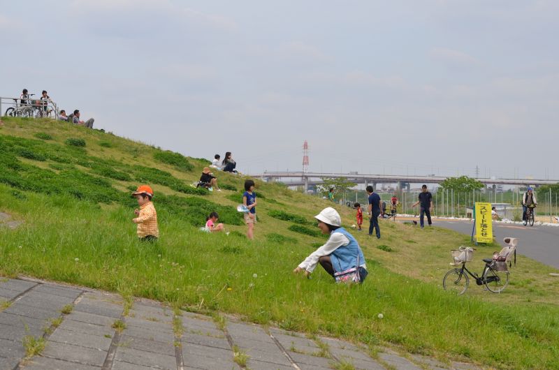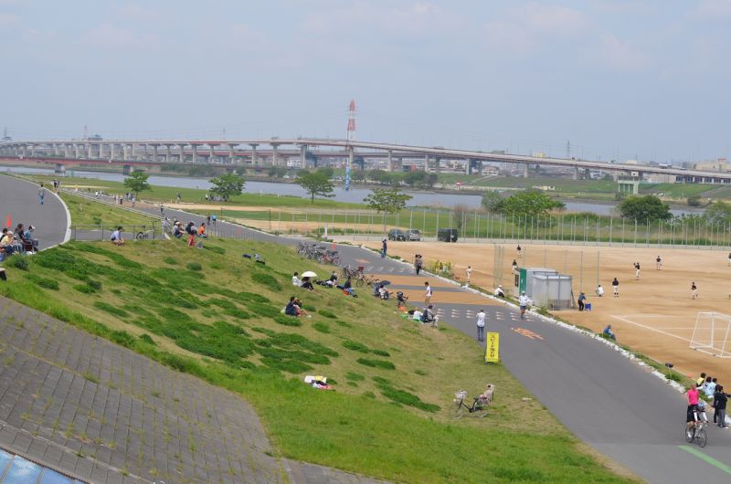 Mọi người có thể đi dạo trên bờ đê, đi picnic dưới ven sông. Những ai thích hoạt động thể thao có thể đạp xe đạp, chơi bóng đá, bóng chày.Vào dịp cuối tuần khung cảnh ba mẹ ngồi xem, cổ vũ con mình trong các trận đấu bóng đá hoặc bóng chày, hay cùng con thả diều, câu cá ở ven sông, dẫn con đi dạo để khám phá nhiên trông thật thanh bình. Xen kẽ giữa những sân bóng đá, bóng chày là những thảm cỏ xanh mướt, hay những khoảnh đất được trồng rất nhiều loài hoa tạo thành những nét chấm phá xinh xắn cho bức tranh hai bên bờ. Ở giữa không gian ngột ngạt của đô thị thì không gian nơi công viên bờ sông vừa rộng rãi, có sông nước, có mây trời, có gió thổi hiền hòa để ta tận hưởng bầu không khí trong lành. Công viên ven sông cho ta cảm giác một Tokyo nhộn nhịp nhưng cũng rất đỗi bình yên.