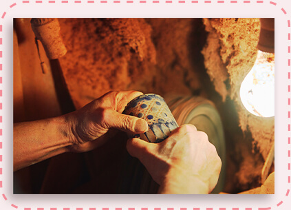 Bột nhám mịn hơn được sử dụng cùng với đĩa kim loại ở bước trước để phục vụ việc khắc hoa văn chi tiết hơn. Độ rộng dài, nông sâu và hình dáng của từng vết cắt được tỉ mỉ thực hiện để tạo nên hoa văn mong muốn. Đây là công đoạn quan trọng quyết định tạo hình của các hoa văn hiện hữu trên thành phẩm.