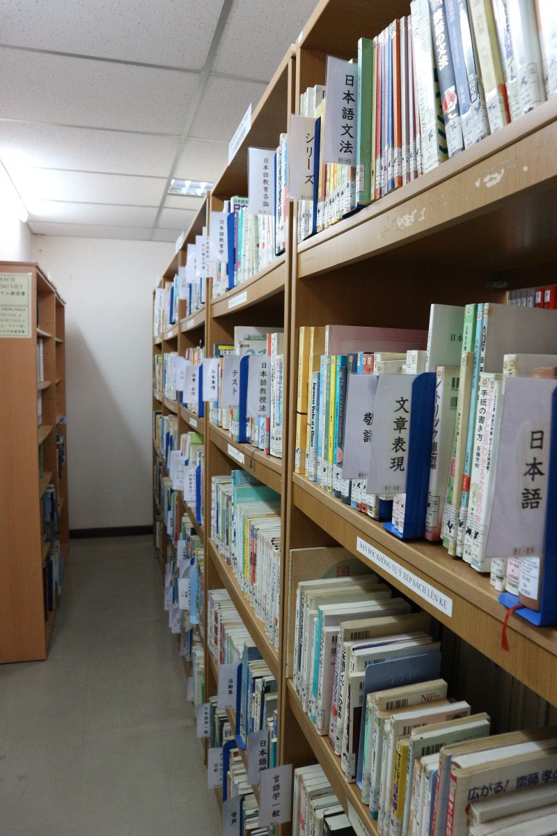 Hàng trăm cuốn sách với rất nhiều chủ đề khác nhau như bộ sách giáo trình “Minna no Nihongo” bản tiếng Nhật, “Shin Nihongo Kiso”, “Living Japanese”, “90 Days of Japanese Language Kanji Notes”. (Ảnh: Ngô Phương Thảo)