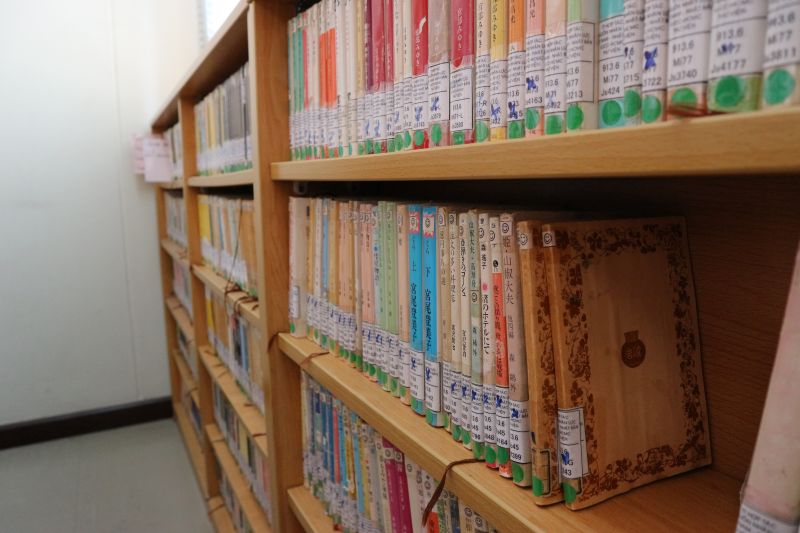 "Kho báu" văn học Nhật là đây. Bạn có thể mượn về nhà những cuốn sách có chấm tròn xanh ở gáy sách. (Ảnh: Ngô Phương Thảo)