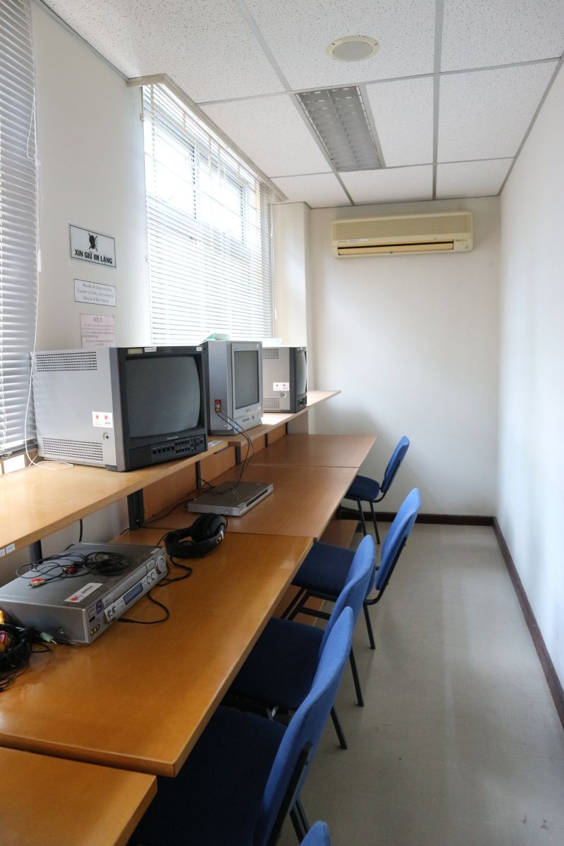 Khi cần luyện nghe, bạn hãy hỏi thủ thư để mượn đầu CD, đĩa và vào phòng Đa Phương Tiện nhé. Khu vực tài liệu luyện thi năng lực Nhật Ngữ cũng được đặt sau bàn thủ thư để bạn có thể dễ dàng mượn học. (Ảnh: Ngô Phương Thảo)