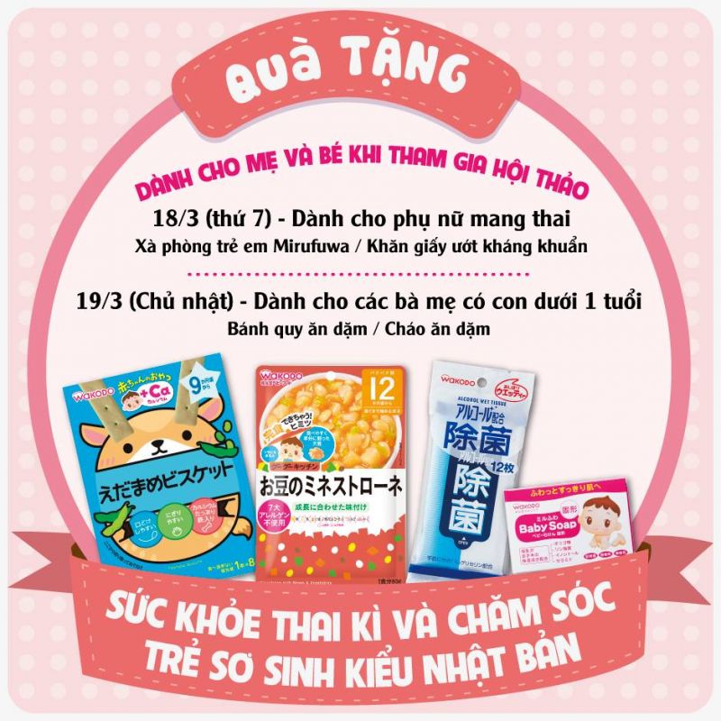 Đợt 2: Thực phẩm Nhật Bản cho trẻ em (bánh quy ăn dặm loại chứa Sắt hoặc Vị đậu nành, Cháo ăn dặm Wakodo-Sữa Mát Cho Bé đậu/cá ngừ) + 2 voucher mua sắm tại cửa hàng Nhật Bản Plus Mainichi - Japan Shop in town (50.000 VND/voucher)