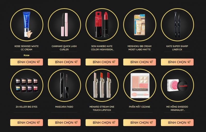 Các sản phẩm được đề cử ở hạng mục trang điểm gồm: Za Killer Big Eyes, Kóse Sekkisei White CC Cream, Meishoku BB Cream Moist-Labo Matte, má hồng Shiseido, Canmake Quick Lash Curler, son Kanebo, phấn mắt Cezane, Mascara Fasio, Kate Super Sharp Liner EX, Menard Stream One Touch Lipstick. Trong đó, Son Kate Color Highvision Rouge dành vị trí quán quân trong đợt bình chọn này ở hạng mục sản trang điểm.