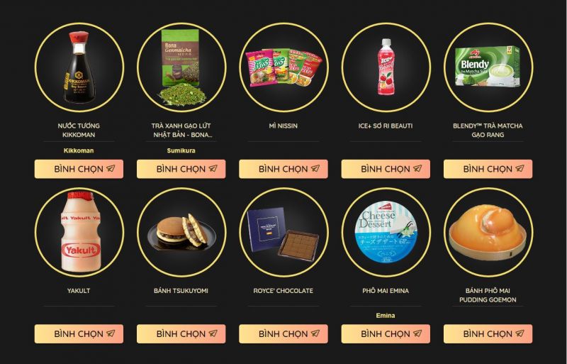 10 sản phẩm được đề cử ở hạng mục Thực phẩm & đồ uống, gồm: nước tương Kikkoman, bánh phô mai Pudding Goemon, trà xanh gạo lứt Nhật Bản - Bona Genmaicha, phô mai Emina, Royce'c Chocolate, sữa uống lên men Yakult, Ice+ sơ ri Beauti, trà matcha gạo rang Blendy, bánh Tsukuyomi, mì Nissin. Tuy vào thị trường Việt Nam chưa lâu nhưng sữa uống lên men Yakult giành trọn tình cảm của người tiêu dùng Việt, sản phẩm này đạt được số lượng bình chọn cao nhất ở hạng mục thực phẩm và đồ uống.